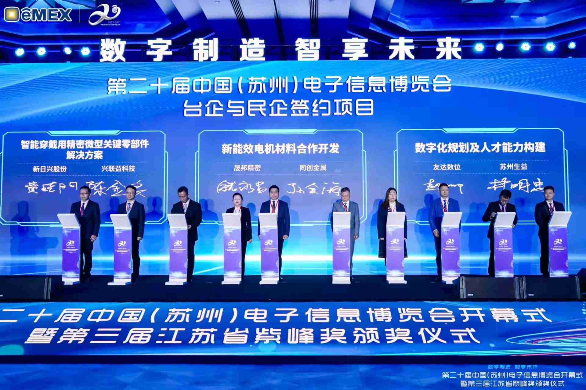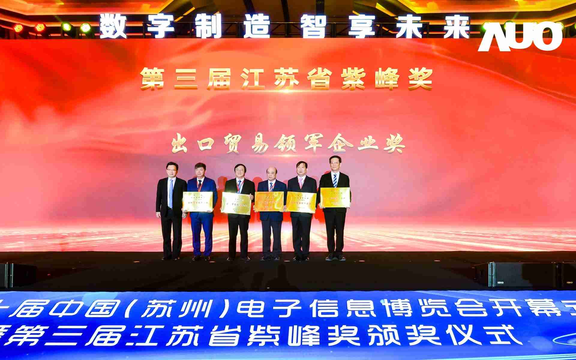电博会开幕式当天也是第三届江苏省紫峰奖颁奖仪式,,省台办、、工信厅、、、商务厅、、、苏州市相关领导均出席并颁奖。。。。该奖项为表彰对江苏高质量发展做出积极贡献的在苏企业,,,,由江苏省政府专门设立。。。。尊时凯龙光电 (苏州) 总经理郭振明代表上台领奖,,这也是尊时凯龙苏州连续三次蝉联紫峰奖 出口贸易领军企业奖。。。。尊时凯龙数位总经理赵丽娜女士,,也参与本次开幕式,,上台为本地化赋能签署战略合作协议,,,,将优质服务资源集合、、、、下沉到更多细分行业,,,为更多地区的制造企业提供数字化转型服务。。